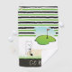 Green, Black and White Stripe golf towel. With fun cat trying to get out of the sand trap, better known as the cat box.