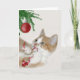 Orange and white tabby cat plays with Christmas ribbon and eyes the ornament on the Christmas tree indulging in Christmas fun and play photo Christmas card