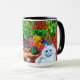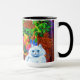 Coffee Mug featuring Louis Wain’s animal painting Master of Cat College (1860-1939). A thoughtful white cat with striking blue eyes sits ponderously next to a vibrant assortment of beautiful flowers. The majestic cat college looms in the background underneath a pink and blue sky. A wonderful gift for cat lovers and English art.