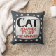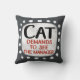 An cute and funny typographic animal design that says "Cat Demands To See The Manager". It features black and red text on a white rectangle with funky, playful white dots surrounding it, all on a grey background.