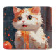 A fluffy white cat, dappled with brown spots, dives headfirst into a mountain of spaghetti. Tomato sauce splatters across its fur and the white tablecloth in a delightful mess. Rendered in a stunning, masterfully balanced composition (think golden ratio!), the illustration evokes the detailed, yet whimsical