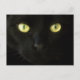 Colour photography customisable postcard featuring close-up portrait of a jet black cat with beautiful green eyes.