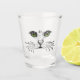This glass shot glass has a black drawing of a cat face with long whiskers and intense green and yellow eyes.