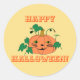 These fun stickers feature my drawing of a cute pumpkin with a cat face design, entwined with green pumpkin leaves. The orange pumpkin has green cat eyes. The text, Happy Halloween, is written in orange letters with the pumpkin centred in the middle. The background colour is pale orange and can be customised to any colour of your selection. Thank you for shopping CherylsArt on Zazzle.