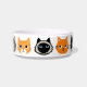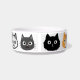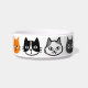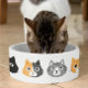 A cool kitty cat bowl for food or water. Cute cat faces including black cat, calico, grey and orange cats, tabby cat, Siamese, and black and white cat. Whimsical cartoon style drawings. ©Jenn Inashvili