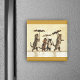 This square magnet has a cat family of two brown adult cats and two kittens all carrying umbrellas while walking in the snow on a pale yellow background with golden borders at the top and bottom.