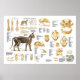 Cat skeletal anatomy poster 24" X 36". The wall chart shows the skeletal structure of the cat with 16 illustrations. Lateral view of the skull with details of the teeth. External and internal views of the skull. Plantar and dorsal views of the bones of the hind paw and fore paw with surface anatomy. Spinal column and rib cage. Ligaments of digit showing action of the claw. Includes dental views and the cats milk dentition.