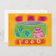 A cute and oh so colourful cat themed painting featuring a green can of cat food with a pink and purple cat, blue flowers and bright yellow background. Text that says Cat Food in scrawled handwriting finishes the piece.