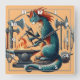 A vibrant cat with dragon-like features uses a hammer to forge weapons beside an anvil, surrounded by various tools and weaponry in a creative setting.