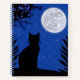 Journal in a silhouette of a cat, gazing at a full moon in a deep blue starry sky