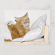 Orange tabby cat waking up with a big yawn in a real bed photo postcard