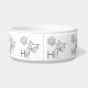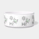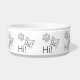 Hi text and drawings of a cat face with green eyes and a paw. Cats greetings. Funny bowl for pets or cats.