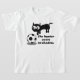 A black and white cat sneaking up on a soccer ball. The humourous text reads “The hunter casts no shadow”. The ball is casting a shadow but the cat is not." The cat is black and has large white eyes, it has no other facial features or whiskers.