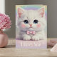 This adorable greeting card features a sweet white kitten wearing a pink bowtie over decorative "I love you" text. It's colorful rainbow background is whimsical and fun, capturing the spirit of the occasion. The perfect card to express your gratitude for that special someone, whether it's your partner, best friend, or family member. Personalize the inside with a custom message to make it even more heartfelt and unique. Ideal for celebrating Valentine's Day, a birthday or just because.