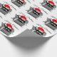 A surly looking cat who has climbed into a Christmas present box. The cat is wearing a red Santa hat. The slogan reads surprise. The slogan reads Merry Christmas. The picture is black and white except for the cats red Santa hat.