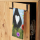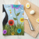 Cute black and white kitty cat with a white love heart on her chest and bright green eyes sitting in some long green grass. She is surrounded by lots of pretty colourful flowers. Leaves and tiny flowers are floating all around her and a butterfly flutters around her head. Digital abstract folk art designed by C.Katt.