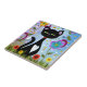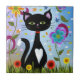 Cute black and white kitty cat with a white love heart on her chest and bright green eyes sitting in some long green grass. She is surrounded by lots of pretty colourful flowers. Leaves and tiny flowers are floating all around her head. Digital abstract folk art designed by C.Katt.