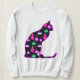 Sweatshirt in a sitting cat silhouette in black, with a holiday pattern of antique Christmas tree ornaments in shades of pink, green and lavender