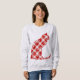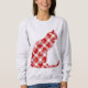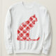 Sweatshirt in a sitting cat silhouette in holiday pattern of red and white buffalo plaid and scattered snowflakes