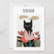 Black kitty cat peeks from behind a flower garden, contemporary, trendy colours, illustration of clouds, cat, flowers, leaves.