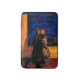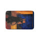 This bath mat features a gorgeous golden, orange and brown tortoiseshell cat sitting on a red pillow, staring out the window into a midnight blue sky. She casts a shadow on the gold coloured wooden window sill.