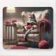 A cat sits on a ragged armchair diligently knitting with red yarn