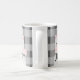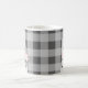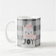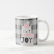 Cute holiday season mug with an illustration of a white cat wearing pink beanie and knitted scarf. Charcoal gingham chequered background. On the cat's belly it says "joy." Sweet winter design for cat lovers.