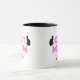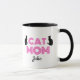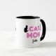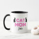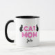 This cute cat mom mug features the words, "CAT MOM" in hot pink along with the silhouette of two cats. You can customize the mug with your name. In addition, you can choose from multiple coffee mug styles and colors. Copyright peachesthetuxedocat