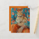 Woman, a cat mum, dressed in turquoise orange boho style outfit holding a cat on her lap - Cat Mother’s Day