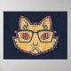 Retro-vintage cartoon nerd cat in horn-rimmed glasses. It seems to be saying, "Meh ow." Distressed, colour graphic, on t-shirts, hoodies, cards, gifts.