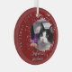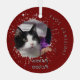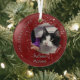 Splatter pattern on a Christmas Red Glass Ornament. Stylish modern holiday ornament with pet's name featured in fun typography in white on a dark red background, over your cutest cat photograph. Brand new Zazzle Christmas Pet Ornament for 2025.