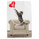 Tabby cat standing on a beige leather chair playing with a red heart balloon for 80th birthday.