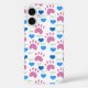 Are you looking for a gift for the cat lover in your life? This phone case features a pattern of pink cat paws, blue hearts and green meows.