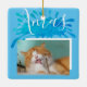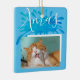 Cat Pet Blue Xmas Script Christmas Photo Ceramic Ornament. The design has a Xmas text in white script on a blue colour splash. Personalise the ornament with your cat or any pet photo and make a great holiday keepsake ornament or a unique gift. Also great with your family photo.