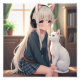 a girl with headphones sitting next to a white cat and a white cat sitting next, Miho Hirano, furry art, trending on pixiv, white ( cat )