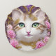 Round decorator pillow with a beautiful painting of a cat with pink and gold roses