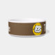 Add your pet's name to this fun bowl that features a cartoon style illustration of a cat smiling. Brown background.