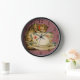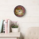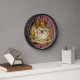 The size of the clock is dramatic and the abstract alcohol ink design is soothing and intricate at the same time. I chose the black frame that adds pop to the blue and gold design. The gold printing would be better in a slightly darker or larger font. I love it and I’m looking for just the right place in ny new apartment. I would recommend this clock for a personal gift or a present. I feel that the quality is excellent for the money! I’m a bit of a clock nut so I’m pretty particular about my purchases. The clock is larger in diameter than many if the clocks I have, so it stands out very well. I think a slightly darker printing color and a moderately larger size would best suit a professional decor or add more impact in a work place item.