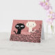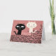 BLACK AND WHITE CATS LOOKING AT EACH OTHER, THE CARD HAS PINK BACKGROUND AND READS LOVE ALL OVER THE PLACE, AND ALSO MEOW A COUPLE OF TIMES. INSIDE IT SAYS "LOVE AT FIRST MEOW"