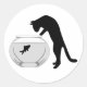 Silhouette of a curious cat gazing into a fish bowl while the fish looks back.