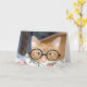 Orange tabby cat with glasses lies in bed with his books in the background waiting to be read photo greeting card. Books png purchased from Painted on my Soul for use. Great card for cat lovers, teachers, librarians.