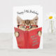 Cute tabby cat with red glasses reading a red book on white background for 54th birthday.