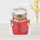 Cute tabby cat with red glasses reading a red recipe book on whitewashed wood background for general birthday.