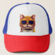 cat with glasses drinking coffee trucker hat