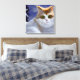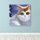 Unique canvas art featuring a white/orange cat with green eyes on a snowy winter day.