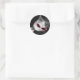 A sticker featuring a black and white photo of a cat with pink sunglasses and claws.