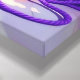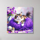 A wall art with a sweet kitty cat sitting on a ball of purple yarn and next to a purple vase of flowers.