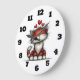 A clock with a whimsical drawing featuring a big orange red kitty cat.