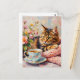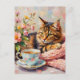 The image is featuring a fluffy, brown and black tabby cat with striking yellow eyes. The cat is nestled in a soft, pink knitted blanket. In the foreground, there is a delicate, light blue teacup and saucer adorned with small pink flowers and gold trim, filled with tea. A bouquet of pink and yellow flowers with green leaves is positioned near the teacup.
