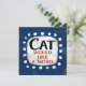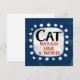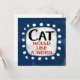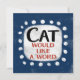 An irreverent and cute typographic animal design that says "Cat Would Like A Word". It features black and red text on a white rectangle with funky, playful white dots surrounding it, all on a blue background.